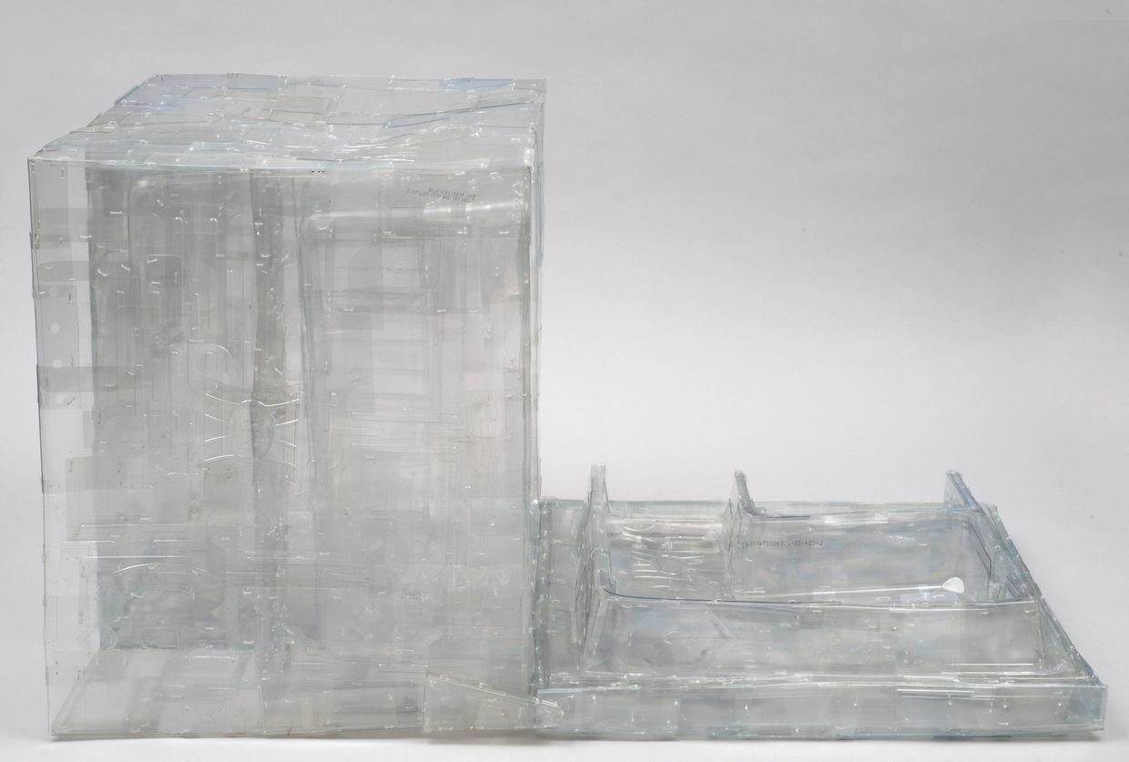 Used-by, 2025. 49 x 90 x 49 cm. Sculpture. Plastic food containers, nylon. Photography by Justin Piperger.